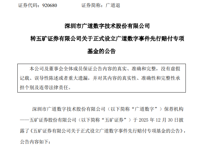 广道退于2025年12月30日公告显示,五矿证券已设立广道数字事件先行赔付专项基金,规模达2.1亿元,用于赔付适格投资者因公司信息披露违法违规遭受的投资损失。