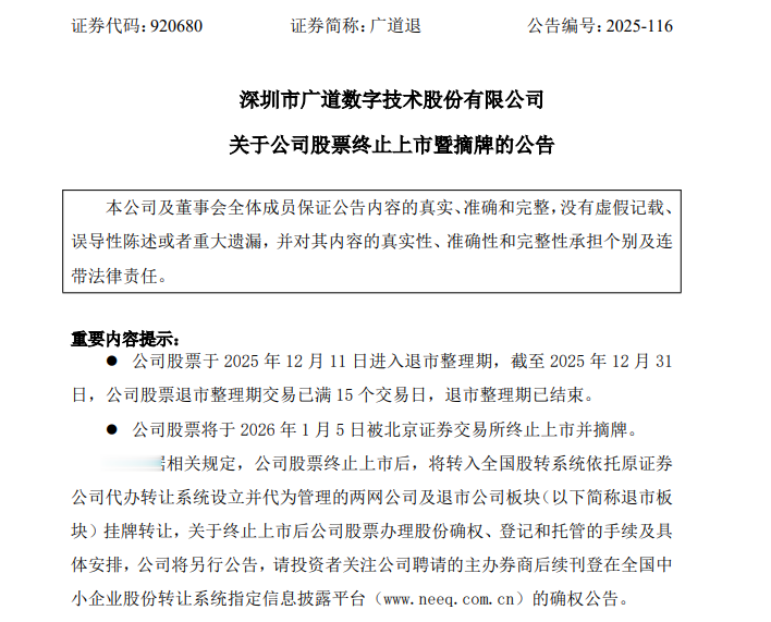 2026年1月5日晚,深圳市广道数字技术股份有限公司(下称“广道退”)发布公告,公司股票被北京证券交易所终止上市并摘牌,成为新年首家退市股票,这也是北交所首家退市股票。
