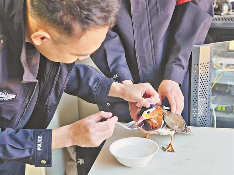 民警接过这只“落难”小鸟,经仔细辨认和检查,确认其为国家二级保护动物鸳鸯。这只小鸳鸯双翅出现轻微冻伤,加之长时间受低温侵袭,已体力严重透支。为让小家伙尽快恢复,民警用消毒后的毛巾为它擦干冰霜、做好保暖工作,准备温水和小鱼小虾补充体力,每日定时观察体征、细致调整照料方式。